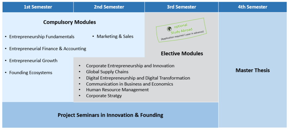 The Master's programme in Entrepreneurship & Innovation is designed to last four semesters and combines projects with sound theoretical knowledge. What makes this programme special is its consistent practical relevance: each semester, you will take part in project seminars in which you will learn about professional practice from different perspectives and can apply your knowledge directly. You will have the opportunity to contribute and develop your own ideas at any time.