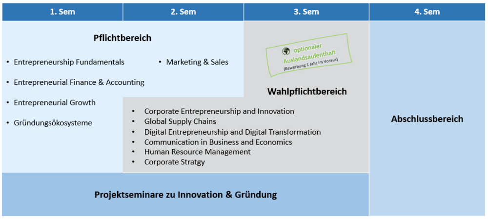 Im Pflichtbereich erhaltet ihr zu Beginn eine fundierte Einführung in das unternehmerische Denken und Handeln. Die Module vermitteln Wissen zu Themen wie Gründung, Wachstum, Finanzierung, Marketing und dem Gründungsökosystem.